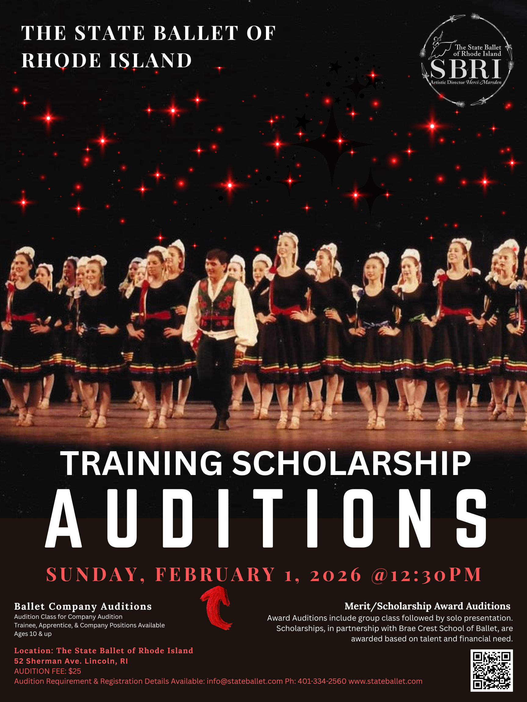 Mark your calendars for Sunday, January 25th due to the impending winter weather we have postponed the auditions for the following week Sunday, February 1st, for The State Ballet of Rhode Island’s annual company auditions! These auditions are held for both company placement and training scholarships/merit awards in partnership with Brae Crest School of Ballet.